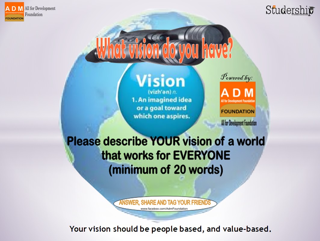 the week – that as leaders, it is essential we have a vision. Theodore Hesburgh had advised that ‘the very essence of leadership is that you have to have a vision’, a vision that is people-based, value-based and creates a mental illustration (picture) of a world that works for everyone – an illustration which you can clearly articulate in every situation. Apart from having a vision, another step to developing the leader in you is that you need to seek clarity on your values. Identify and live your life by core values; you may make a commitment to live by the values of integrity, responsibility, credibility, appreciation, ‘exemplarity’, among others.